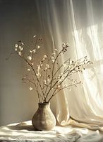 Dit kunstwerk vangt een moment van pure rust, waarin gedroogde takken worden beschenen door zacht ochtendlicht. De fijne details van de kleine, fragiele bloemetjes contrasteren prachtig met de strakke lijnen van de eenvoudige, aardse vaas. Door het warme, subtiele lichtspel ontstaat een kalme, bijna meditatieve sfeer die uitnodigt tot…