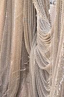 Vissersnetten hangen te drogen in een haventje in Normandië, Frankrijk. Beige neutrale kleuren met prachtige patronen in de visnetten.