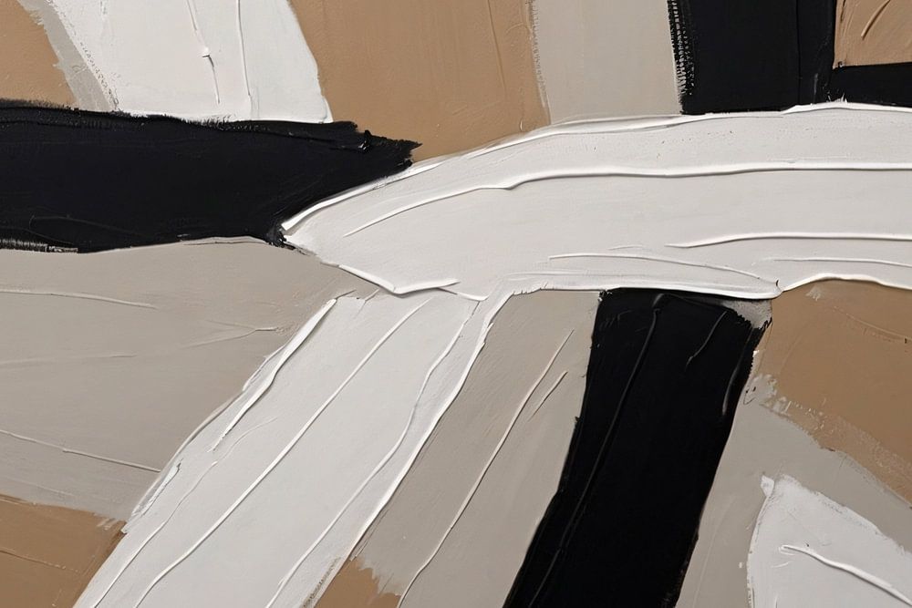 Ontdek de harmonie tussen eenvoud en visuele rust met dit minimalistische kunstwerk. De subtiele overlapping van vormen in tinten van beige, zwart en wit zorgen voor een uitgebalanceerd palet dat rust en ingetogen elegantie uitstraalt. Elk element in deze compositie draagt bij aan een gevoel van sereniteit, waardoor dit stuk een perfecte toevoeging is voor diegenen die waarde hechten aan moderne, gestroomlijnde interieurs. Of het nu wordt opgehangen in een drukke woonkamer of een stille studeerkamer, dit kunstwerk is een oase van kalmte die de omgeving complementeert zonder deze te overweldigen. Een tijdloos stuk dat nooit uit de mode raakt en bij elke verandering van seizoen of inrichting zijn relevante schoonheid behoudt.