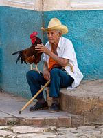 Koop de foto Bejaarde man met haan in kleurrijk Cuba van Luc de Zeeuw op canvas, aluminium dibond, (ingelijste) fotoprint, behang en ArtFrame, op maat geprint in Fine-Art kwaliteit.
