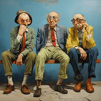 Drie oudere heren zitten naast elkaar op een eenvoudig bankje voor een monochrome blauwe achtergrond. Elk van hen is op zijn eigen manier in gedachten verzonken. Degene links draagt een hoed en een gestreept pak, zijn hand op zijn kin. Degene in het midden kijkt naar voren met wijde ogen en een rode stropdas. Degene rechts draagt een geel jasje en een ronde bril en laat zijn hoofd peinzend rusten. De scène lijkt kalm en introspectief, een momentopname van ouder worden en individuele contemplatie in een gedeelde ruimte.