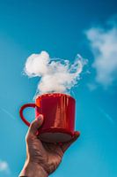 Een felrood kopje wordt gehouden tegen een felblauwe lucht waaruit wolken lijken op te stijgen. Deze surrealistisch ogende afbeelding speelt met de grenzen tussen werkelijkheid en fantasie en verandert een alledaagse scène in een magische momentopname. Perfect voor liefhebbers van creatieve fotografie en speelse kunst. Dit stuk brengt…