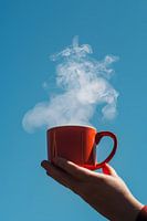 Een felrood kopje wordt gehouden tegen een felblauwe lucht waaruit wolken lijken op te stijgen. Deze surrealistisch ogende afbeelding speelt met de grenzen tussen werkelijkheid en fantasie en verandert een alledaagse scène in een magische momentopname. Perfect voor liefhebbers van creatieve fotografie en speelse kunst. Dit stuk brengt…
