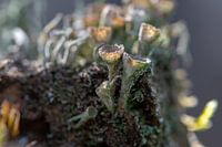 Bekermos is geen plant maar een korstmos. Een samensmelting van een wier een een schimmel. Het zonlicht raakte net de boomstronk waar het bekermos op leeft.