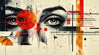 Dit schilderij toont de indringende en intense blik van een vrouwengezicht achter abstracte geometrische vormen en lijnen. De strakke lijnen en levendige kleuren van de abstracte elementen vormen een betoverende achtergrond voor de spookachtige ogen van de vrouw. Haar blik doordringt het abstracte en trekt de kijker mee in de diepten van haar gedachten en gevoelens. De combinatie van de intense aanwezigheid van de ogen en de abstracte omgeving geeft het tafereel een mysterieuze maar fascinerende sfeer. Deze afbeelding nodigt de kijker uit om geïnspireerd te raken door de kracht en schoonheid van de blik en de abstracte vormen.