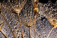 "Bekijk het eens vanaf de andere kant: De gedragen druppeltjes!" is een macrofoto van waterdruppeltjes op vruchtpluisjes van een morgenster van schuin onderaf gefotografeerd. Deze bewerkte foto heeft beige / bruintinten en een blauw met wit en grijze achtergrond.