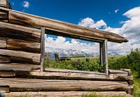 De Grand Tetons door het raam van een verlaten schuur. Wyoming, USA.
