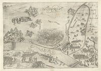 Beleg en inname van Deventer door het Staatse leger onder Maurits, 10 juni 1591. Plan van Deventer en het omringende land met schansen en wallen. Met twee schipbruggen over de IJssel. Zonder de legenda onder de plaat.