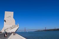Belem, Lissabon, Portugal - rivier de Taag met monument. Blauwe, heldere lucht en de brug van 25 april op de achtergrond.