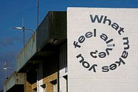 Belettering "What makes you feel alive? " op een muur van Lensw0rld