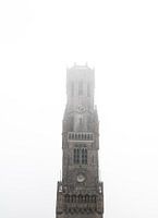 Op een vroege ochtend in Brugge hangt er een lichte mist over de stad. De straten zijn stil, de geluiden gedempt. In het midden van de Markt rijst het Belfort langzaam op uit de nevel. De toren is deels verborgen, alsof hij zich nog even verstopt voor de nieuwe dag.