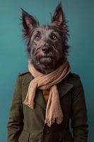 Een Belgische Laekenois belichaamt majestueuze gratie met zijn opvallende, pezige haar en alerte, levendige ogen. Met zijn trotse houding, gehuld in een elegante vacht en zachte sjaal, straalt hij zowel warmte als intelligentie uit. Zijn gezichtsuitdrukking combineert speelsheid met onwankelbaar zelfvertrouwen - een echt charismatische metgezel.