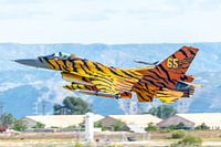 De bijzondere General Dynamics F-16A Fighting Falcon van het 31ste Tiger Squadron van de Belgische Luchtmacht met tijgerprint stijgt op van vliegbasis Zaragoza.