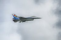 HDR foto van een Belgische F16 piloot aan het werk tijdens de Luchtmachtdagen in Nederland. Hier maakt de piloot met de F16 straaljager een fly-by op hoge snelheid.