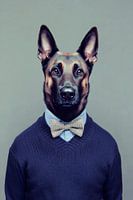 Elegantie ontmoet geestigheid: een Belgische Mechelaar met het hoofd van een stijlvolle heer in de vorm van een piramide, gekleed in een trui en een netjes gestrikte vlinderdas. De aandachtige, spitse oren en doordringende blik geven deze combinatie een charmante vertrouwdheid - alsof hij klaar is om de volgende sociale gebeurtenis voor…
