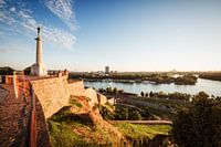 Een zonsondergang in de Servische hoofdstad Belgrado. De foto toont een uitzicht op de samenvloeiing van de rivieren Sava en Donau vanaf het fort Kalemegdan, evenals het standbeeld van Pobednik, het herkenningspunt van Belgrado.