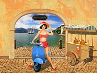 Sexy pin-up girl in bikini op een iconische scooter in Italië. Vakantie in de jaren 50 in de haven.