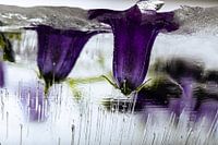 Bloesems van een roze klokjesbloem in kristalhelder ijs