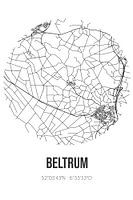 Zwart-witte landkaart, stratenplan of plattegrond van Beltrum. Beltrum is gelegen in de Achterhoek, in de gemeente Berkelland, provincie Gelderland. Op de stadskaart zijn alle openbare wegen in Beltrum opgenomen. Verder is de kaart voorzien van de coördinaten van het centrum van Beltrum.