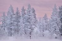 Halverwege de middag in Fins Lapland. De zon gaat alweer onder, wat zorgt voor prachtig gekleurde luchten. Een winters tafereel, 250 kilometer boven de poolcirkel in het oosten van Fins Lapland.