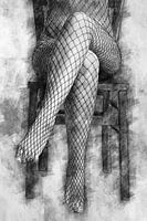 Digitale tekening, mixed potlood en houtskool, van vrouwenbenen welke gehuld zijn in netkousen. Aangezien de vrouw geheel naakt op de stoel zit, maar dit niet op de tekening te zien is, ontstaat een spannende erotische sfeer.