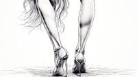 Deze fascinerende zwart-wit illustratie toont de benen van een vrouw die sierlijk op hoge hakken loopt. De elegante houding en eenvoudige lijnen stralen zelfvertrouwen, stijl en tijdloze schoonheid uit. De minimalistische illustratie benadrukt de fijne details van de beweging en de hoge hakken, waardoor de afbeelding ideaal is voor een moderne, eigentijdse esthetiek. Zonder afleidende kleuren vestigt het monochrome palet de aandacht op de formele elegantie en verfijning van de scène. Perfect voor liefhebbers van minimalistische kunst die zowel mode als artistieke expressie waarderen.