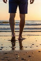 Persoon in korte broek staat op een nat zandstrand bij zonsondergang, met uitzicht op de oceaan. Benen en voeten zijn prominent in beeld.