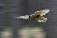 Bengaalse Arenduil ( Bubo bengalensis ) glijdend door het bos, dynamische actie opname, vlucht opname in goede scherpte.
