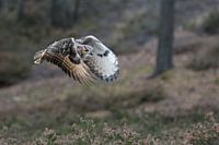 Bengaalse Arenduil ( Bubo bengalensis ), uil vliegt over een open plek in het bos, bijna geluidloze jachtvlucht, zeer mooie vleugelhouding, actie opname.