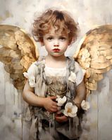 Portret van een klein jongetje met bloemen en engelenvleugels.