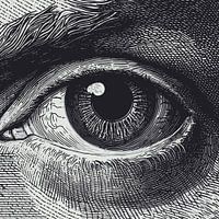 Een kunstdruk met het oog van Benjamin Frankling op een dollarbiljet.