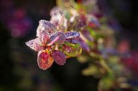 Kleine waterdruppels op de bladeren van de Berberis haag op een vochtige herfstdag.