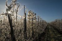 Om de bloesem te beschermen tegen nachtvorst beregenen de fruittelers de bloesem.