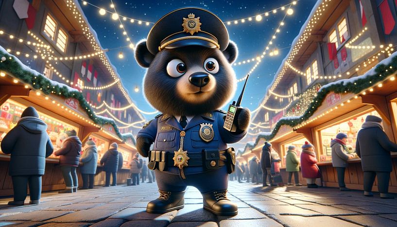 De trotse beer, lid van de dierenpolitie, staat in het midden van de kerstmarkt. Zijn glimmende insigne reflecteert het warme licht van de omringende straatlantaarns, dat weerkaatst op de feestelijk versierde hutten. De ogen van de beer zijn zowel waakzaam als vriendelijk, een teken dat hij zich inzet voor de veiligheid en orde tijdens de feestdagen. Kinderen lachen in de verte terwijl de geur van geroosterde amandelen door de lucht zweeft. De scène is een hartverwarmende weergave van de feestdagen, gevangen in een komische stijl die tot de verbeelding spreekt en een contemplatieve stemming creëert.