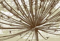 Een gestileerde, grafische weergave van een berenklauw (Heracleum), gezien van onderaf, waardoor de bloemschermen als een waaiervormig patroon naar buiten uitstralen. Er is gebruikgemaakt van strakke lijnen en contrastrijke vlakken in tinten van bruin, beige en grijsachtig groen, wat het geheel een enigszins aards en natuurlijk karakter geeft.