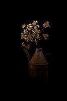 Stilleven met gedoogde berenklauw in een oude olie kan. Eenvoudig klassiek stilleven