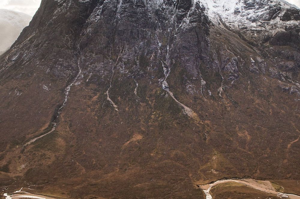 Uitzicht op de Buachaille etive mòr vanaf de Beinn a Chrulaiste in Schotland tijdens een koude november dag. Na een uur wachten totdat het licht niet meer in mijn lens scheen, kwamen de sneeuwstorm en het licht elkaar tegemoet rondom deze prachtige berg! Het was het wachten waard.