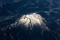 Deze verbluffende foto biedt een ongeëvenaard uitzicht op een imposante berg in de Oostenrijkse Alpen, gezien vanuit het raam van een vliegtuig hoog in de lucht. Het perspectief van bovenaf onthult de majestueuze pracht van dit natuurlijke wonder.