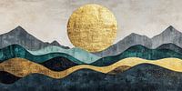 Dit kunstwerk is geïnspireerd op Japanse schilderkunst en toont een abstract landschap met bergen en de zon of maan, die een serene maar krachtige stemming overbrengen.