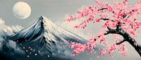 Een majestueuze berg rijst majestueus op onder het zachte licht van de maan, omarmd door mystieke wolken. De delicate, roze bloesems van de kersenboom voegen een romantisch tintje en vrolijke accenten toe aan het tafereel. Dit kunstwerk is ideaal voor in de woonkamer om een harmonieuze en inspirerende sfeer te creëren.