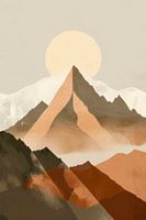 Een majestueuze piek, gehuld in zachte aardetinten, troont in de stilte van de dageraad. De zacht glooiende heuvels en het schaarse wolkendek creëren een harmonieus samenspel van licht en schaduw. Een enorme cirkel van zonlicht, goudkleurig en stralend, faalt niet om de rust van het landschap in een droom te veranderen.