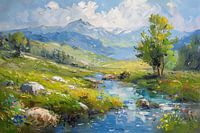 Een idyllisch Alpenlandschap in de stijl van een schilderij.