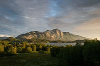 Een berg en wolken in Noorwegen worden mooi belicht door de zonsondergang. Roze tinten over de grijze wolken en groene heuvels. Sprookjesachtige omgeving. Rustieke landschapsfoto.