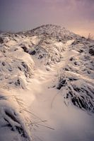 Paarse gloed over de besneeuwde heuvel in de Amsterdamse waterleidingduinen tijdens de zondsopkomst