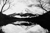 Een majestueuze piek strekt zich uit naar de hemel, zijn besneeuwde top gloeit in het licht, terwijl delicate wolken er als een sluier omheen dansen. Het kalme meer weerspiegelt het indrukwekkende panorama, omlijst door knoestige bomen die het spel van licht en schaduw op fascinerende wijze benadrukken. Een droomachtige natuurlijke idylle die uitnodigt om te blijven hangen.