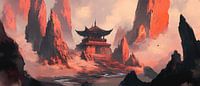 Majestueuze bergen omlijsten een mysterieus gebouw dat gloeit in warme rode tinten. Mist doordringt het landschap en verleent het een mystieke sfeer. Dit indrukwekkende kunstwerk brengt charme uit het Verre Oosten in elke woonkamer en nodigt je uit om je onder te dompelen in een andere wereld.