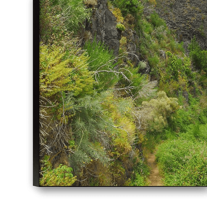 Foto van een rots en bloemen in de bergen van Madeira, Portugal. Het vulkanische eiland Madeira in de Atlantische Oceaan bestaat uit steile bergen die weelderig begroeid zijn. Het eiland staat bekend om de vele bloemen.