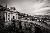 Een zwart-wit impressie uit Bergamo (Lombardije, Italië): De Porta San Giacomo, een van de vier stadspoorten naar de bovenstad.