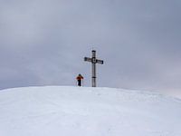 Bergbeklimmers op een bergtopkruis in de Alpen