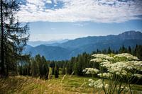 Deze foto legt een Alpenlandschap vast met een schermbloem prominent op de voorgrond. De scherpte van de bloem trekt de blik van de kijker, terwijl de bergen op de achtergrond een rustige en overzichtelijke context bieden. Door deze compositie ontstaat een balans tussen detail en uitgestrektheid, waardoor het beeld zowel structuur als…